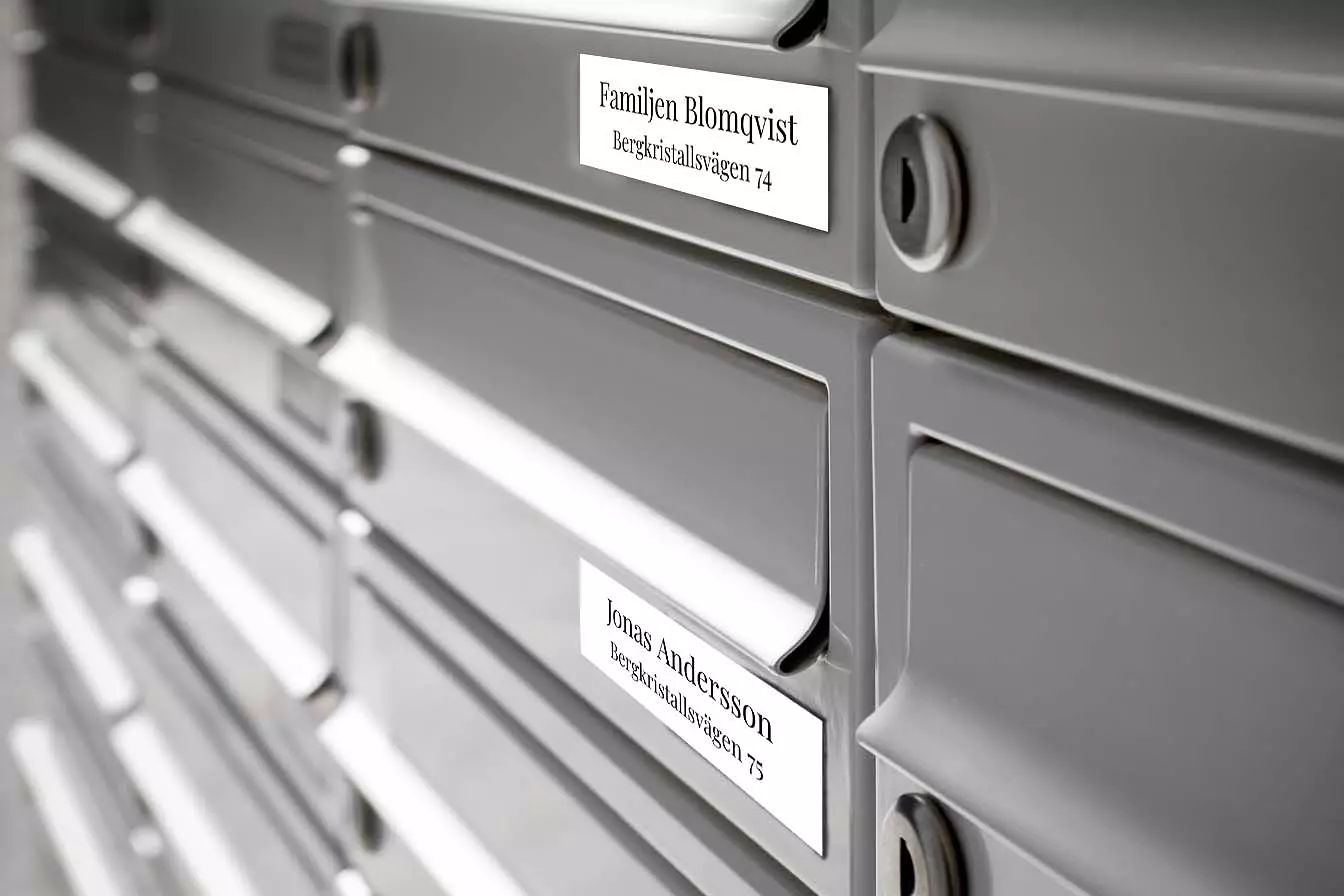 Tydlig märkning för hus, brevlådor och entréer – inklusive husnummer, lägenhetsnummer och “Ingen reklam tack”.